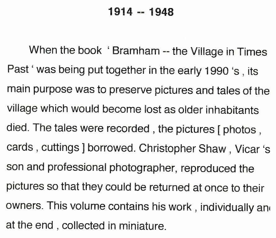 1. The purpose of the book Bramham The Village in Times Past(1994) was to preserve pictures and tales of the village for posterity. Christopher Shaw, a professional photographer and son of the then vicar of Bramham reproduced the pictures. The book is dedicated to Christine Shaw wife of the Reverend Derek Shaw. She died in 1994 before seeing the result of her research on the history of Bramham.