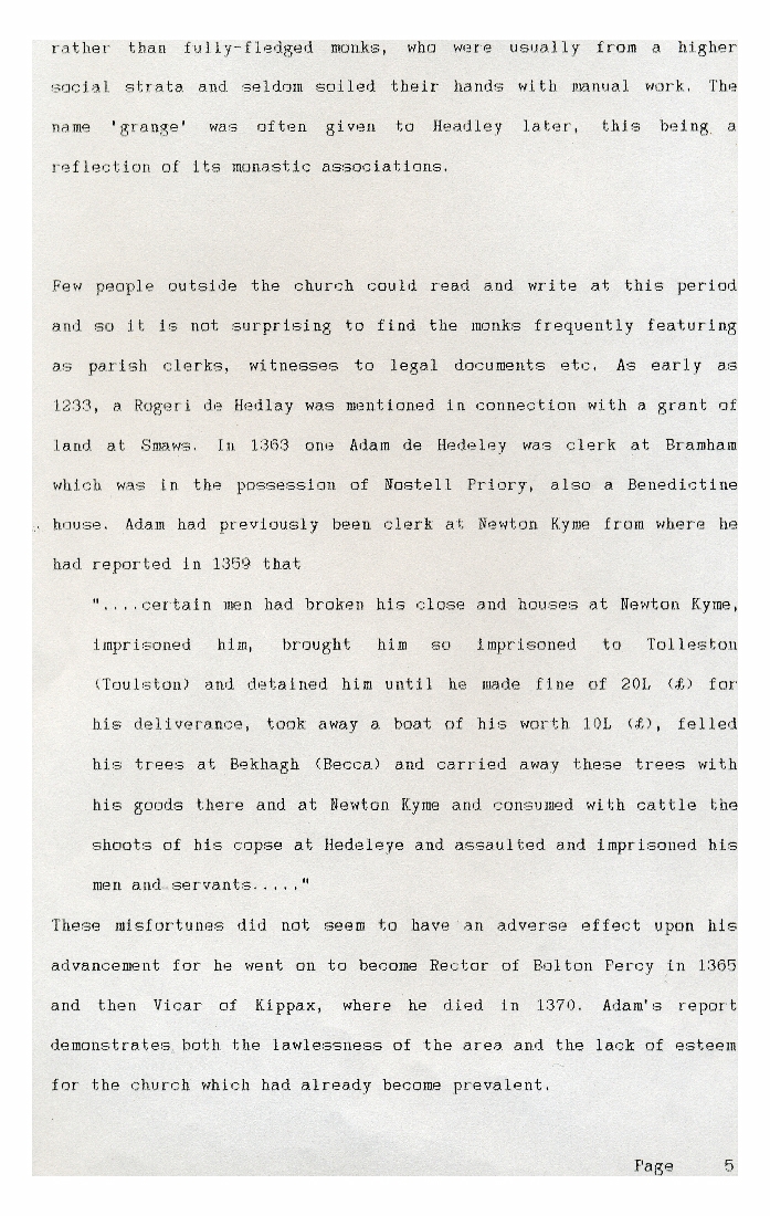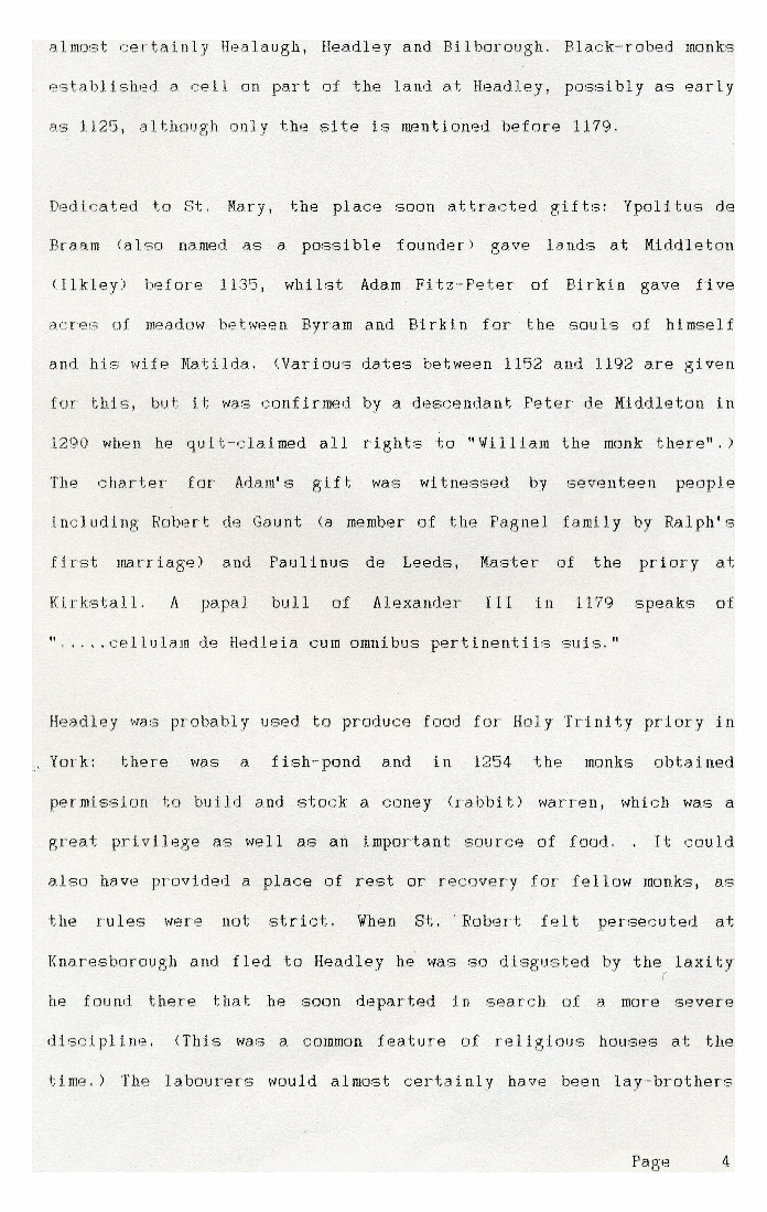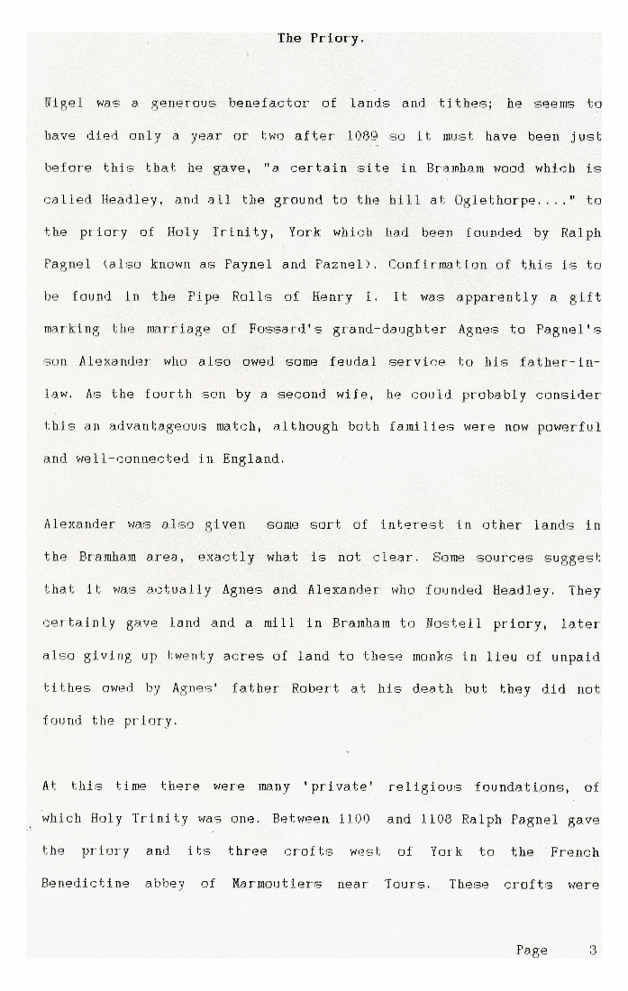 1. Jean Hardy continues by relating how late in the 11th century the owner, Nigel, donated the land between Headley and Oglethorpe to the priory of Holy Trinity, York. The history continues through the 12th, 13th and 14th centuries with stories of the families and the religious connections, mentioning also the formation of the rabbit warren in 1254 as an important source of food.
