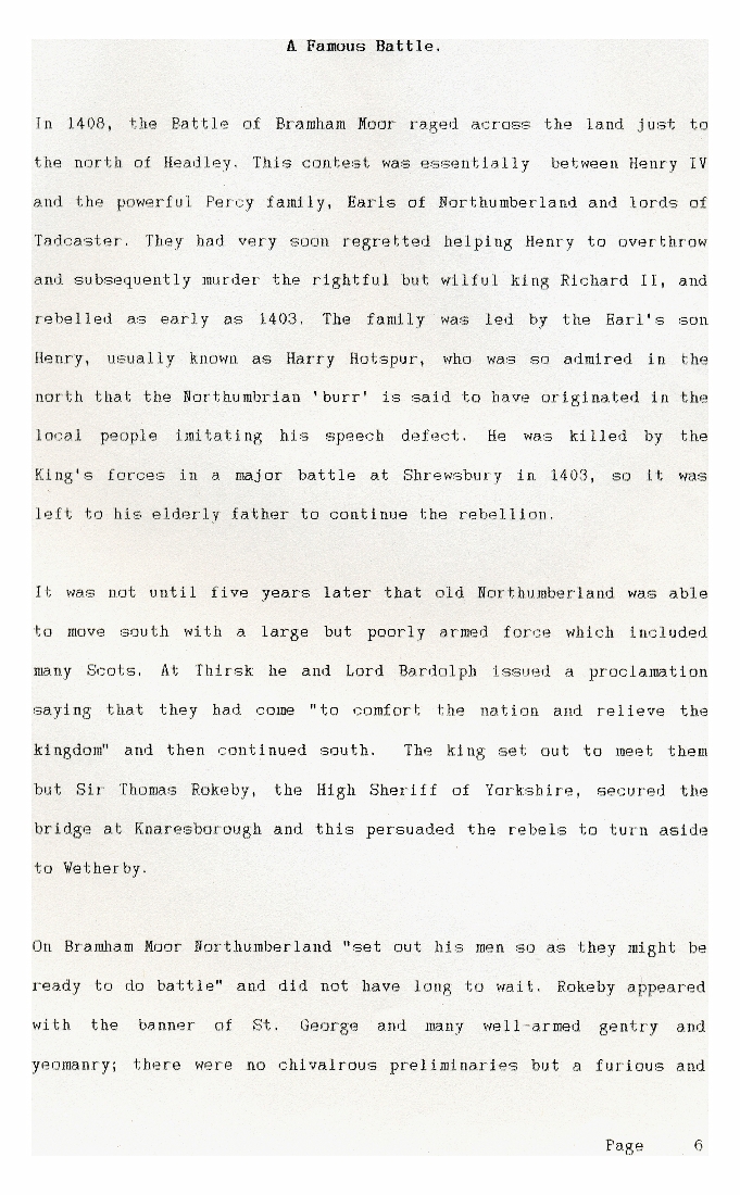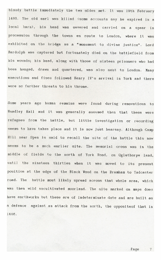 1. A brief history of the Battle of Bramham Moor in 1408 when the Earl of Northumberland was killed. The exact site of the battle is not known precisely and probably extended over a fairly large area of wild uncultivated moorland