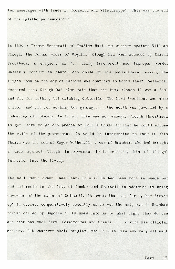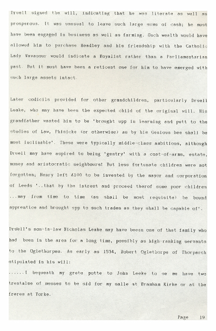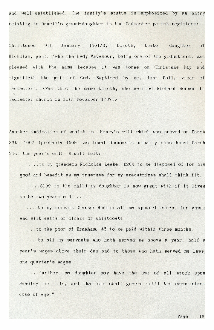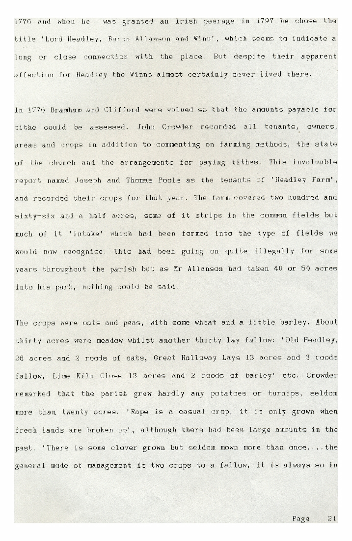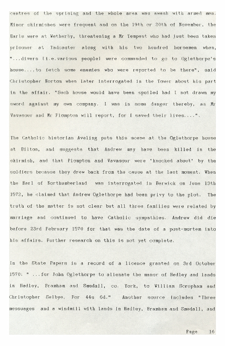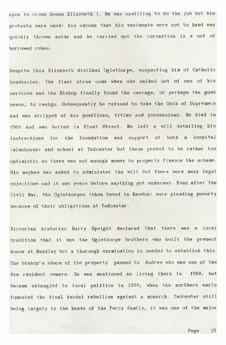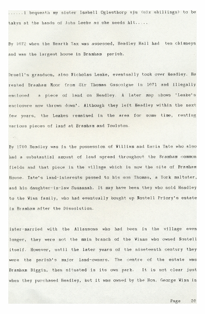 1. Continues the story from the mid 16th century when the land was bought by Owen Oglethorpe (who founded Tadcaster Grammar School and, as Bishop Oglethorpe, crowned Queen Elizabeth I) and his brother. Details are given of various families associated with the land and of its uses up to the late 18th century. An early 18th century sketch map is included on Item 9.