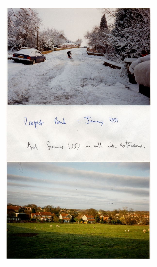 2. Two scenes - Snow covered Prospect Bank in January 1991 and a view of Prospect Bank houses taken from Windmill Hill in the summer of 1997.