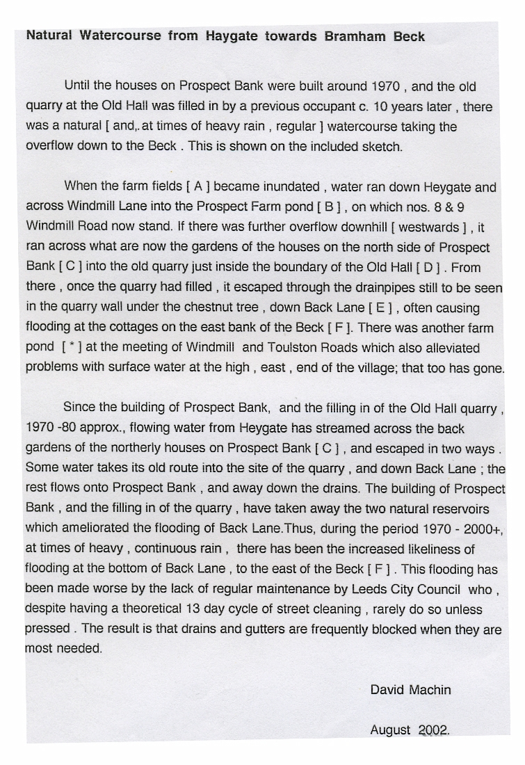 1. & 2. An explanation by David Machin of how the building of Prospect Bank interfered with the long established drainage arrangements from the fields adjoining Heygate Lane resulting in occasional flooding problems in Prospect bank and Back Lane.
