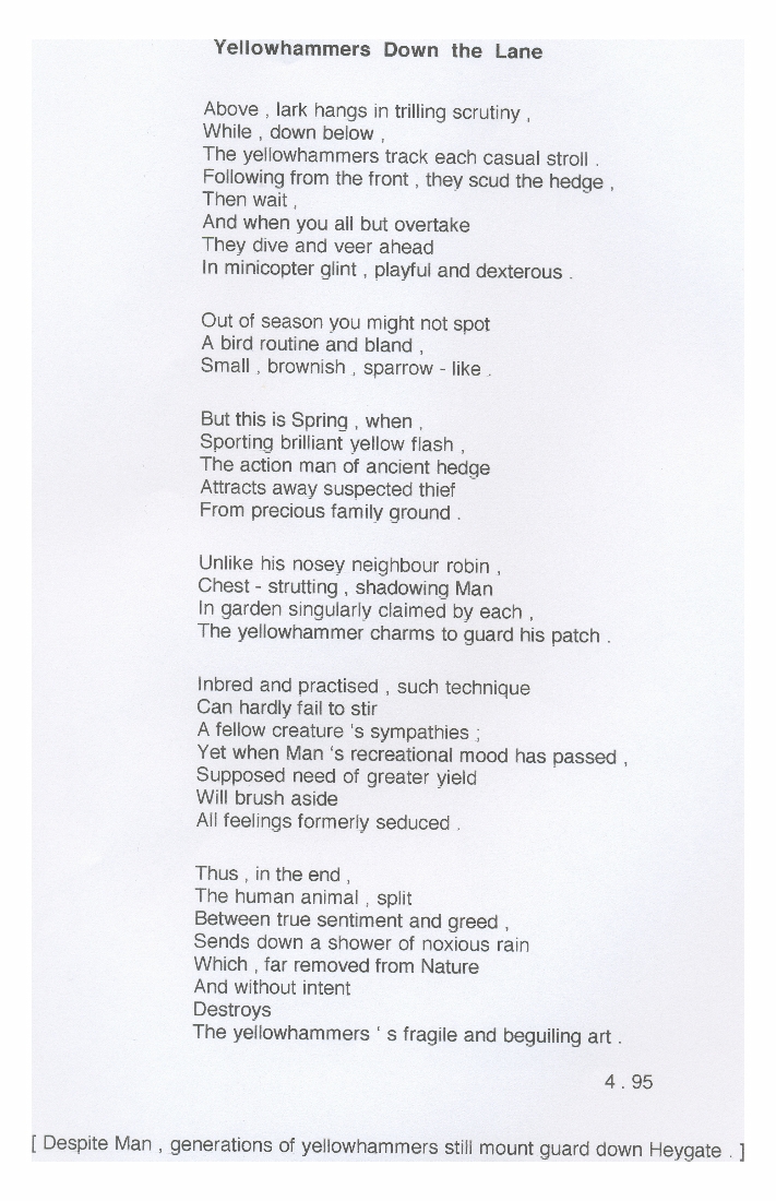 1. A poem, dated April 1995, on Yellowhammers (in Heygate Lane?) and on the effects of modern farming methods on their lives.
