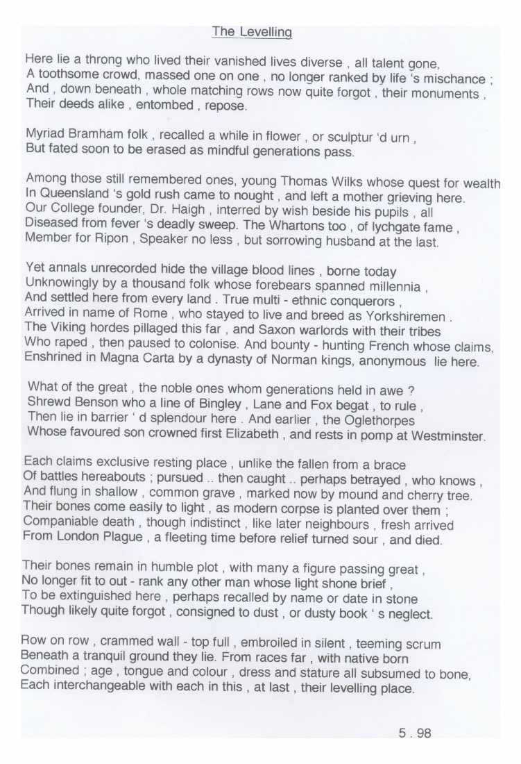 1. A poem to all those now lying in equal state side by side in Bramham's churchyard irrespective of their origins or lifetime status.