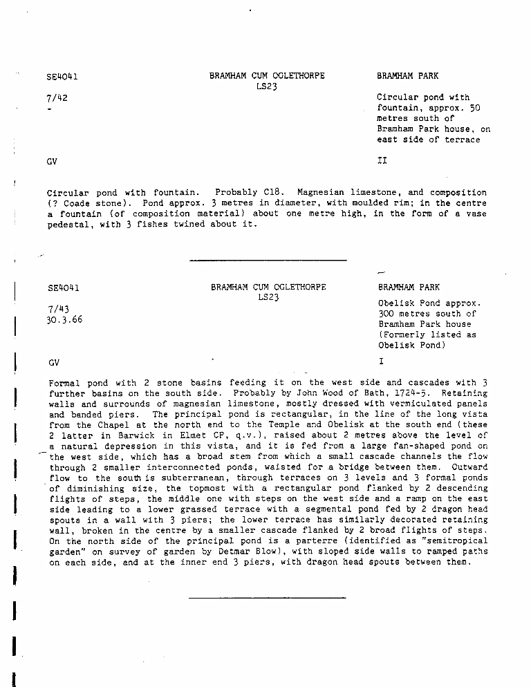 2. Details, dated 30-3-1966, of circular pond with fountain approx 50 metres south of Bramham Park house (listed Grade II) and of Obelisk Pond approx. 300 metres south of Bramham Park house.