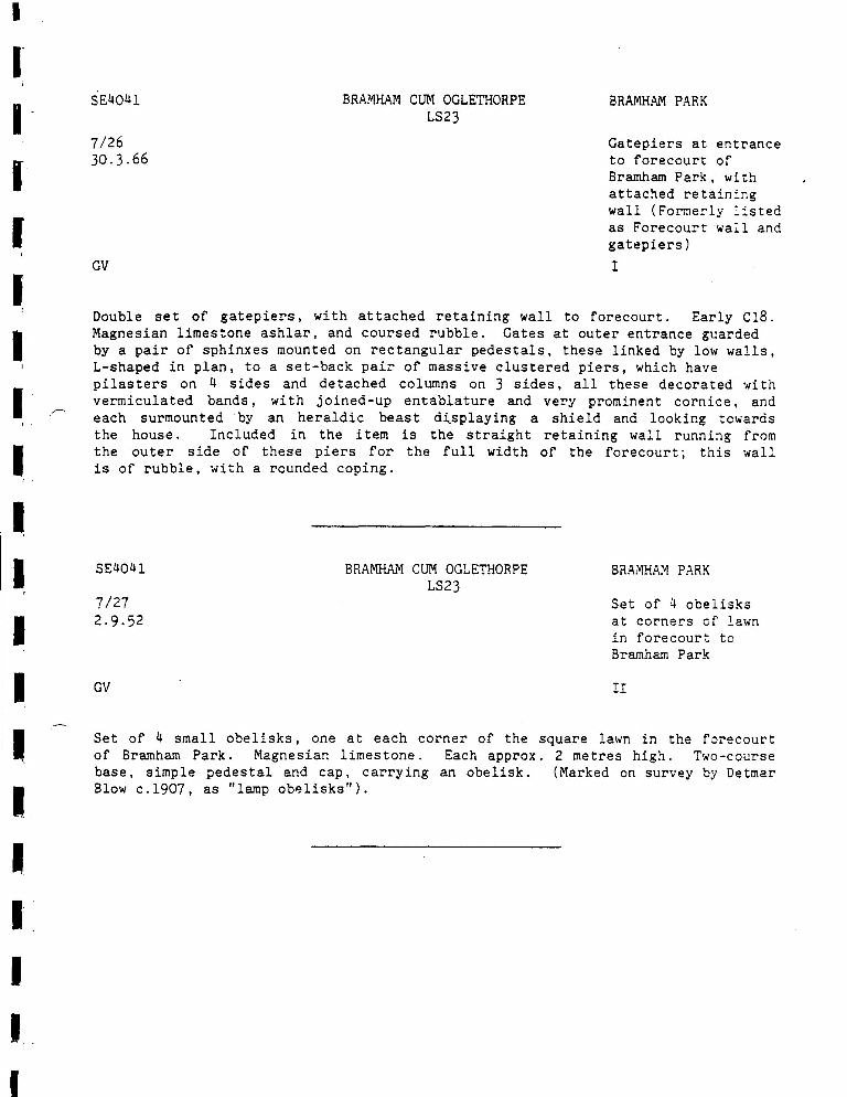 3. Details, dated 30-3-1966, of Gatepiers at entrance to forecourt of Bramham Park with attached retaining wall, plus details, dated 2-9-1952, of Set of 4 obelisks at corners of lawn in forecourt to Bramham Park (listed as Grade II).