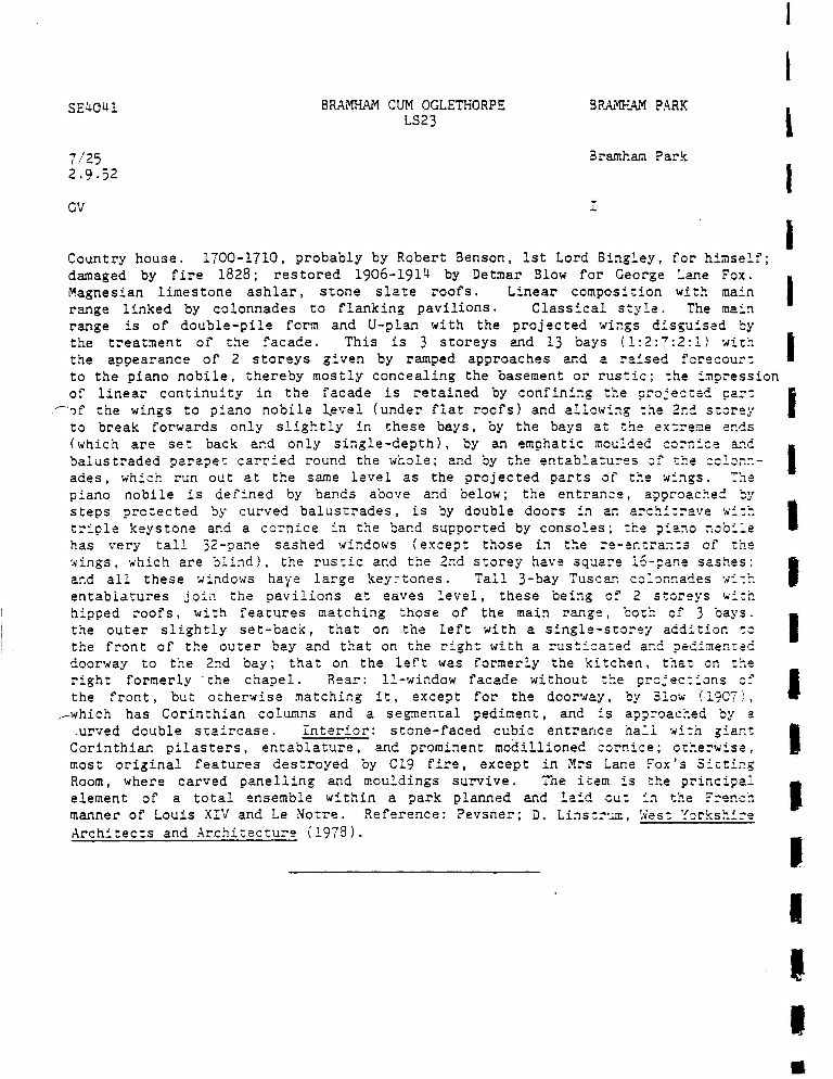 4. Description, dated 2-9-1952, of Bramham Park house.