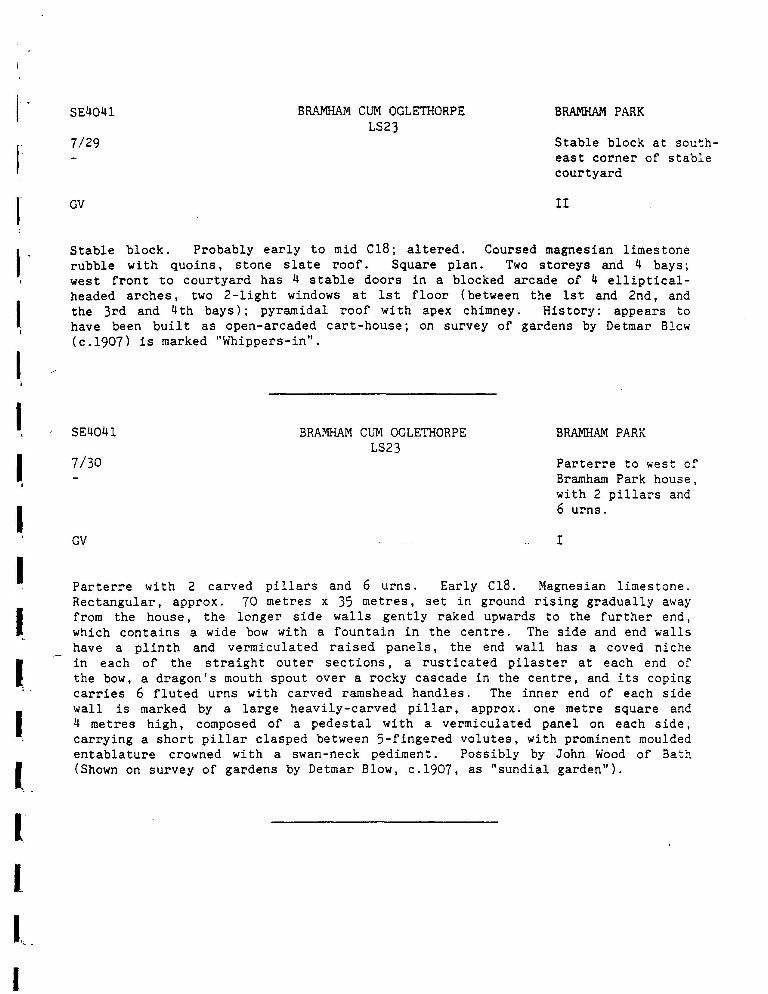 6. Description of Stable Block at south east corner of stable courtyard, plus description of Parterre to west of Bramham Park house with 2 pillars and 6 urns.