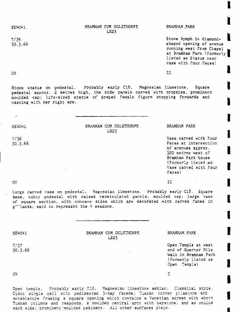 7. Description, dated 30-3-1966, of Stone Nymph in diamond shaped opening of avenue running west of Bramham Park (listed Grade II) plus description, dated 30-3-1966, of Vase carved with Four Faces at intersection of avenues approx. 320 metres west of Bramham Park house (also listed Grade II).