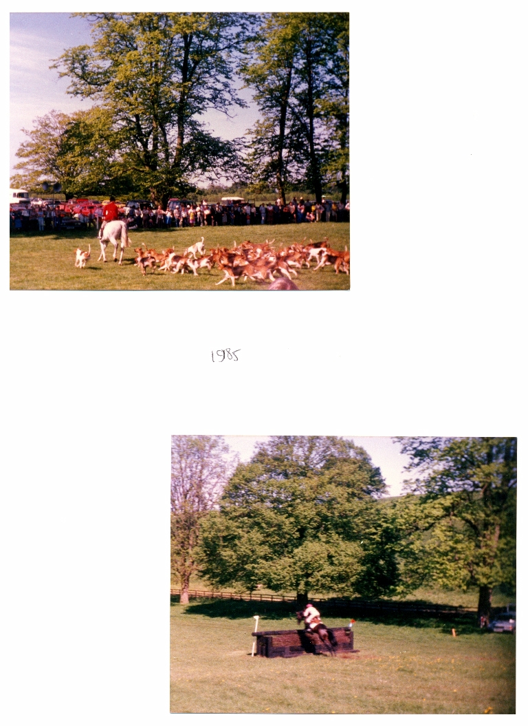 9. A further 1985 photo of the foxhounds plus one of a rider clearing one of the cross country jumps.