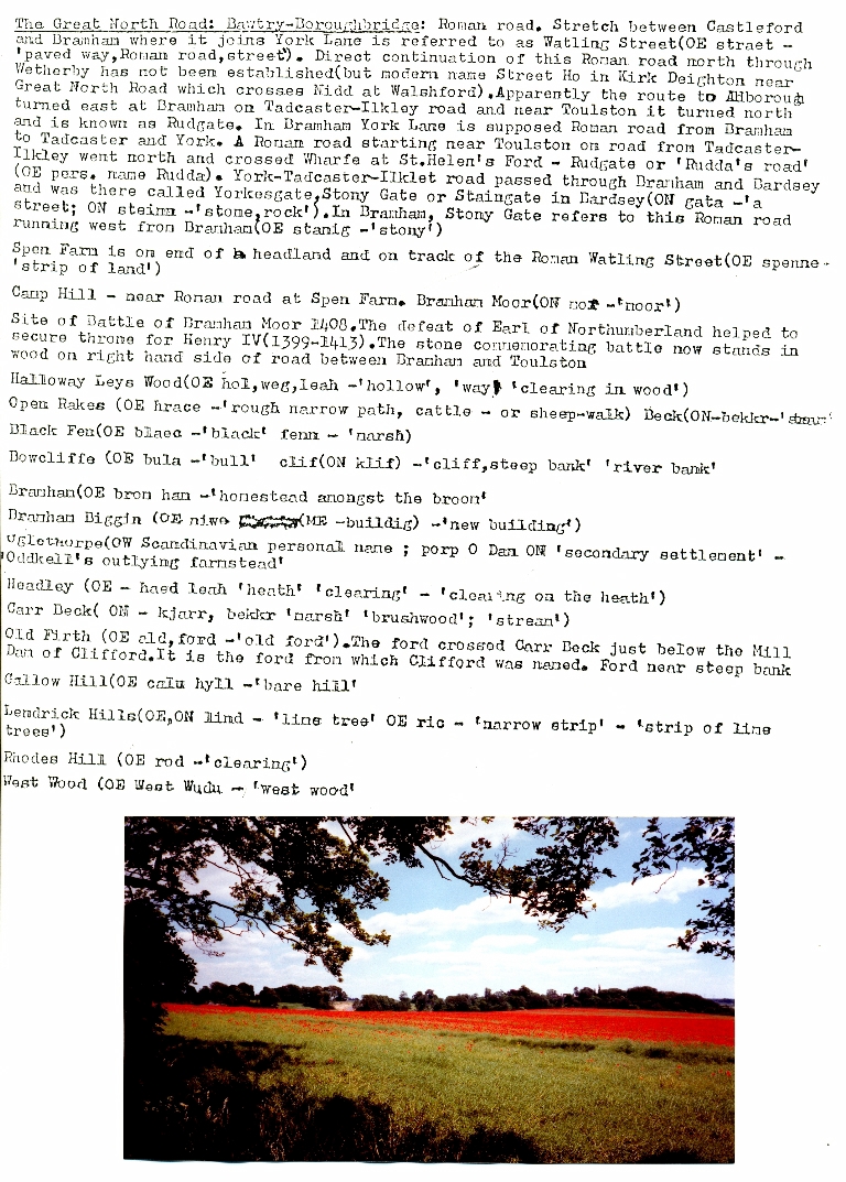 1. Some details of the Roman origins of the Great North Road and of other local roads together with an explanation of the origins of various names of places and features in and around Bramham.
