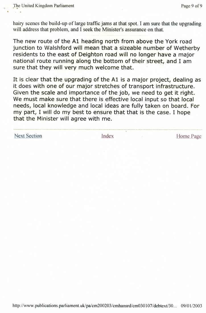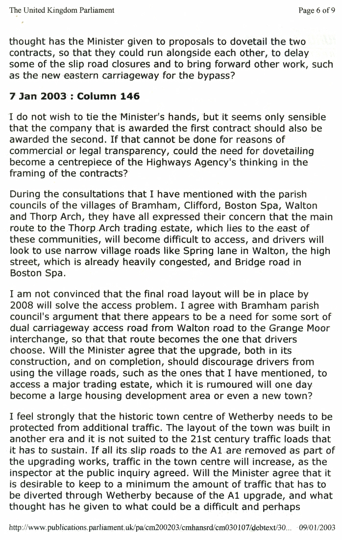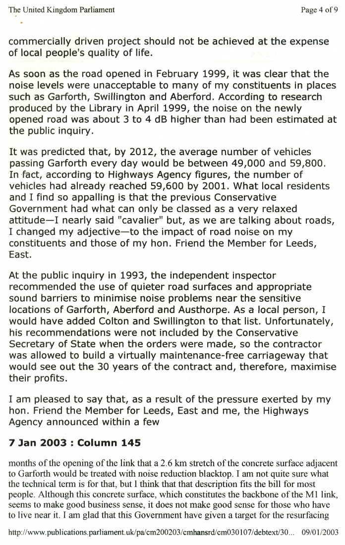1. - 7. These seven pages are a transcript taken from Hansard of the speech made in the House of Commons by Colin Burgon MP on 7 January 2003 in the period leading up to the Public Inquiry scheduled for 24 February 2003 on the upgrading of the A1/M1 motorway. He makes an urgent plea for noise reduction and safety requirements to be fully dealt with and full consideration to be given to the wishes and knowledge of local people.