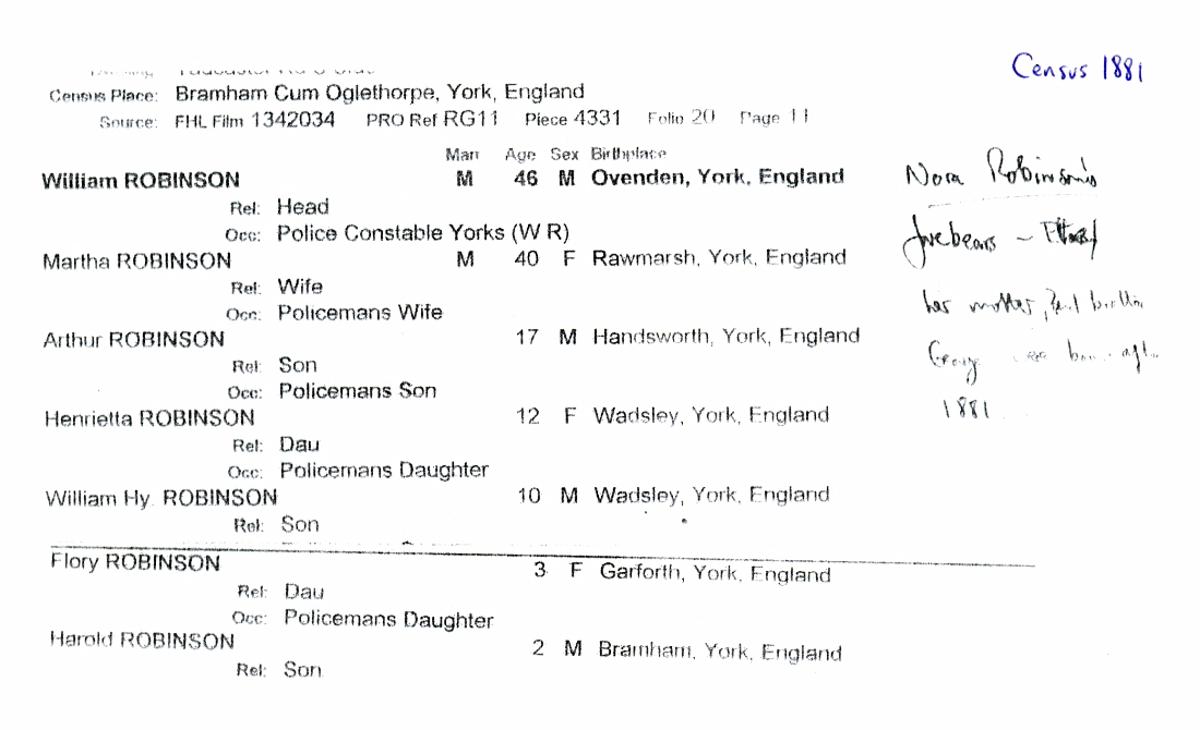 2. The census of 1881 notes several Robinson families scattered around Bramham, working at various trades. Of note is the fact that the village policeman is William Robinson.