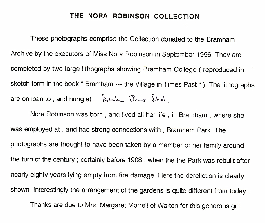 1. Introduction document describing how the Bramham Archive was bequested the photographs and lithograph of Bramham Park by Miss Nora Robinson.