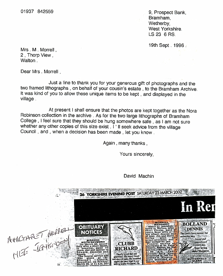 2. Letter to Mrs Maragaret Morrell of Walton from David Machin thanking her for the photographs and framed lithograph. Plus newspaper cutting of the death of Mrs Morrell in March 2002.