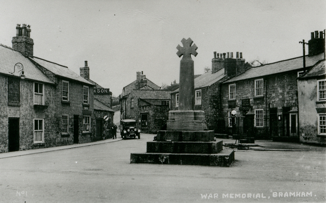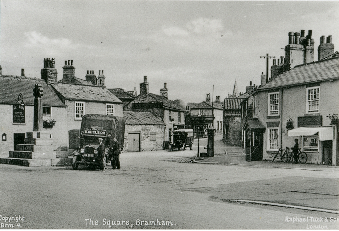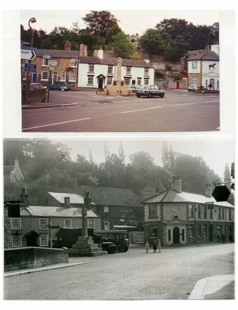 1. A colour photo dated approx. 2000 and a black and white photo, probably about a century earlier, taken from the edge of Bowcliffe Road a few metres from the front of the Bay Horse looking towards the bottom of The Square