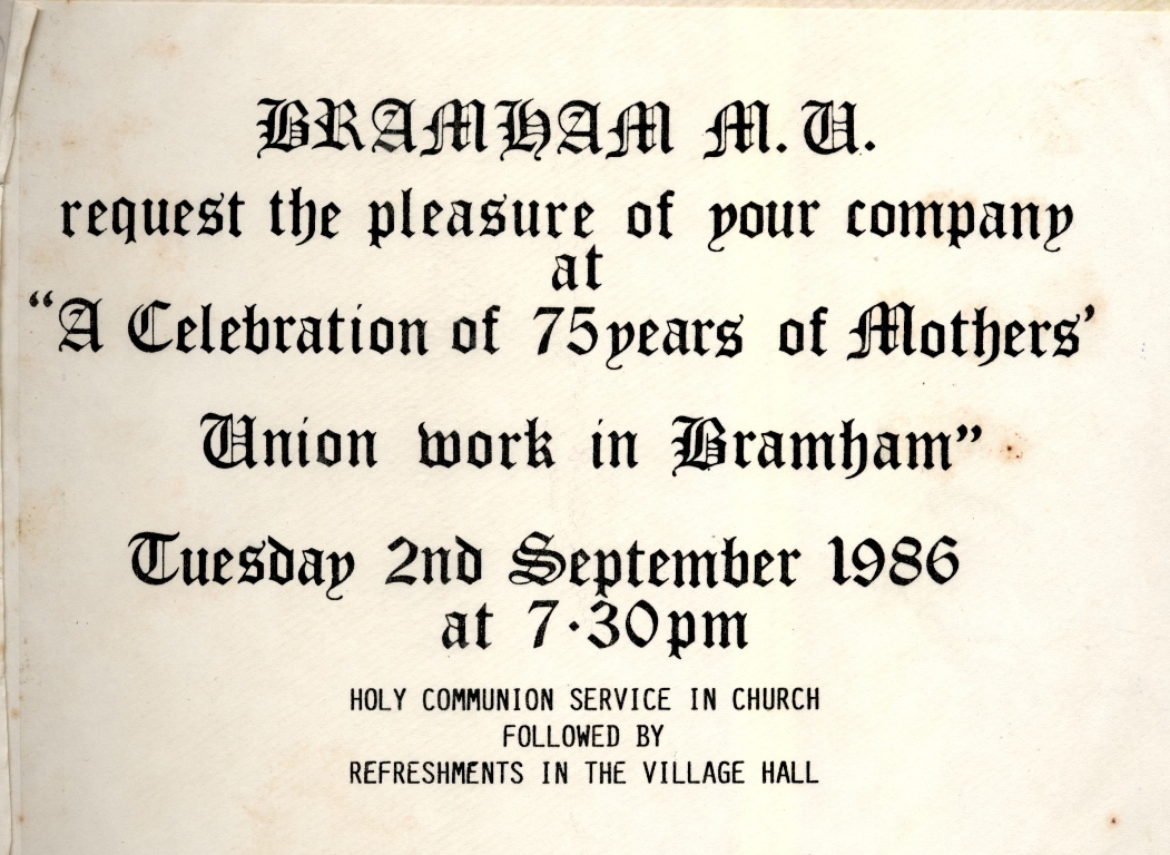 1. An invitation to "A Celebration of 75 Years of Mothers Union Work in Bramham dated 2nd September in 1986.