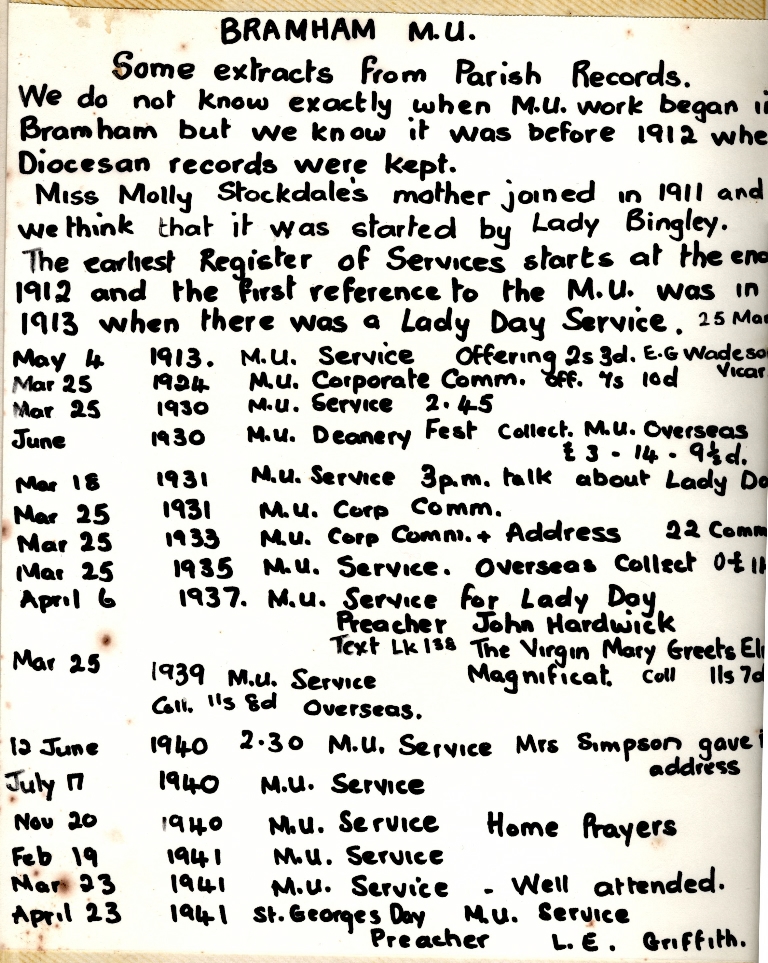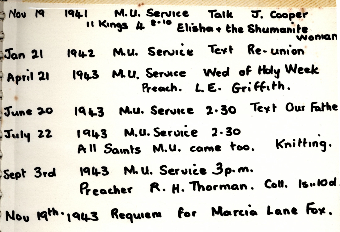 2. & 3. Extracts from parish record showing dates and a few details of Mothers Union church services between 1912 and 1943.
