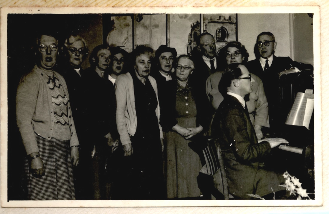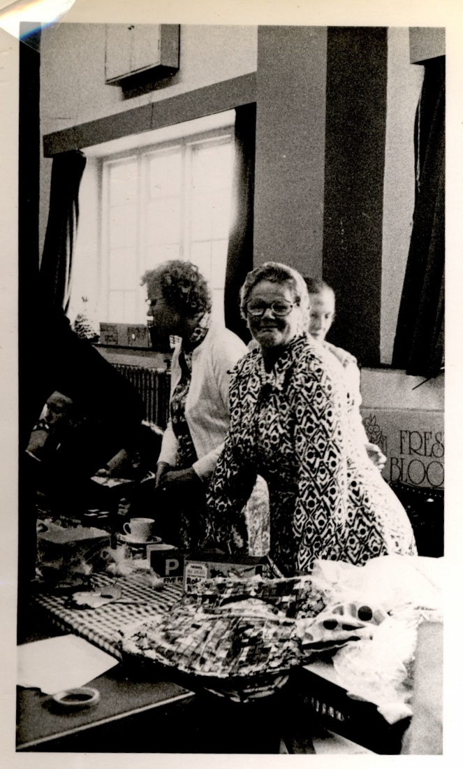 2. Large group, mostly ladies, dining in a festively decorated hall, undated.