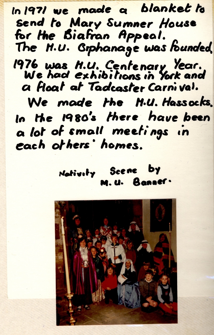 11. A note on the activities in 1871, 1976 and the 1980s, plus a photo of participants in a nativity scene in the church.