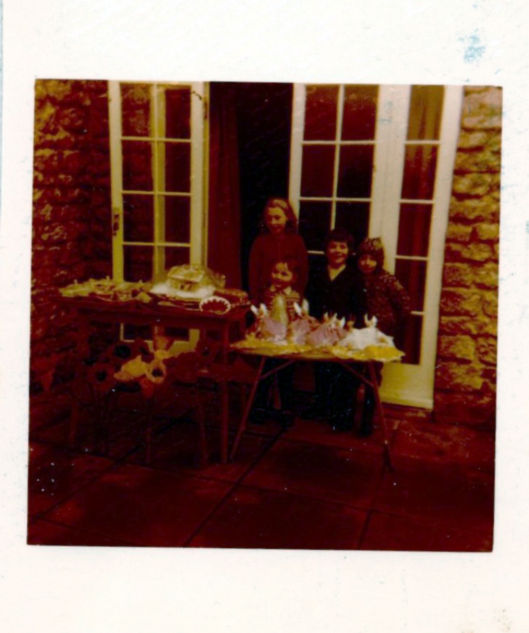 9. Mother and three children who appear to be selling cakes and model fairies.
