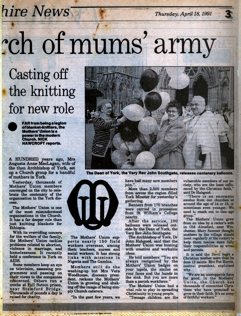 1. An article written on 18 April 1991 on the occasion of the centenary celebration of the organisation of the Mothers Union in the York diocese. It shows a photo of the Dean of York releasing balloons and summarises the variety of work undertaken.