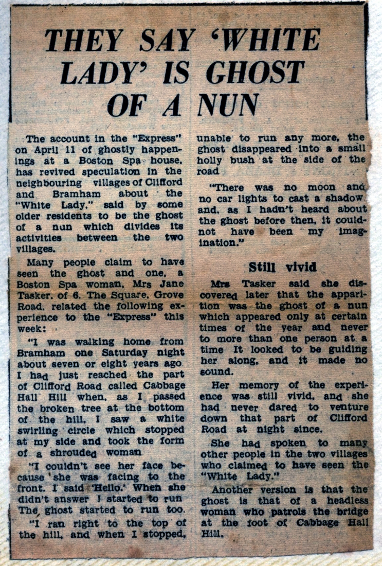 2. A write up on the "White Lady", the ghost of a nun, said to haunt the Cabbage Hall Hill area of Clifford Road.