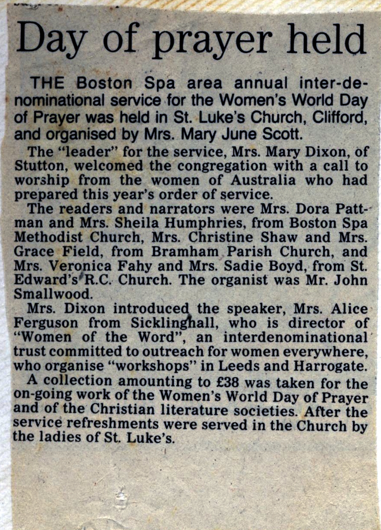 3. Undated report on the Boston Spa area annual inter-denominational service for the Women's World Day held in St. Luke's Church, Clifford.