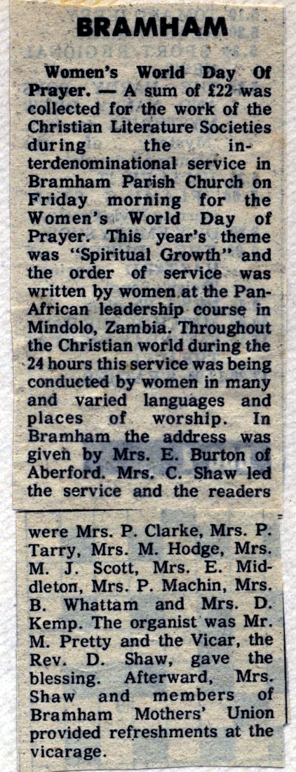 4. An undated report on the inter-denominational service in Bramham Parish Church for the Women's World day of Prayer, the year's theme being "Spiritual Growth". Afterwards members of Bramham Mother's Union provided refreshments in the vicarage