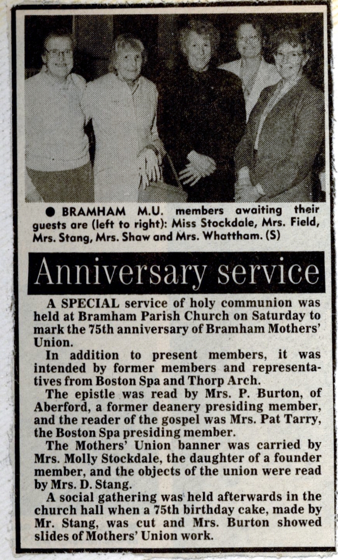5. A report on the service held in Bramham Parish Church to mark the 75th anniversary of Bramham Mothers' Union. A photo shows Miss Stockdale, Mrs. Field, Mrs. Stang, Mrs. Shaw and Mrs. Whattham awaiting their guests at the gathering afterwards in the church hall.