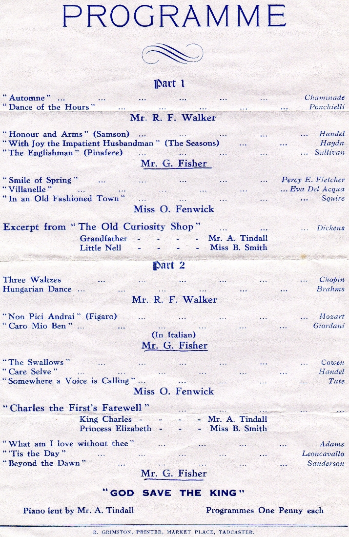 11. Programme of Music and Oratory at Bramham about mid 1930's. Villagers names include George Fisher and his good friend Arthur Tindall.