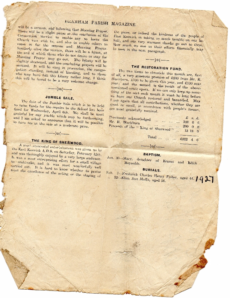 3. Burial announcement in the Church Magazine 1927, for Frederick Charles Henry Fisher who was father to George and Miriam Fisher and husband to Harriet Yates.