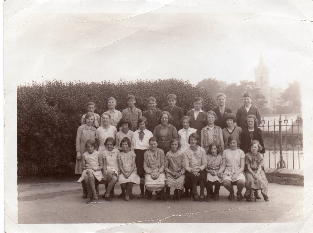 4. Bramham School photo circa 1928. William Arthur Henry Thornton is on the back row wearing glasses. Note the view of the Parish Church in the background.
