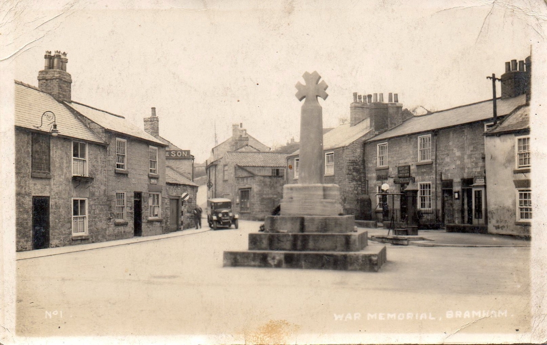 5. 1920's photograph of Bramham Village Square showing the war memorial. Harriet Fisher's shop is on the left (double fronted) - husband Fred's van is parked in front of the shop.