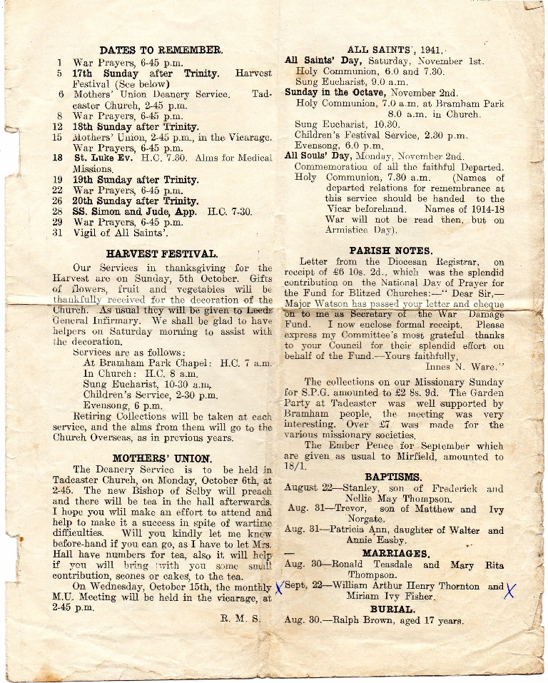 6. & 7. Pages from the Church Magazine announcing the marriage of William Arthur Henry Thornton to Miriam Ivy Fisher.