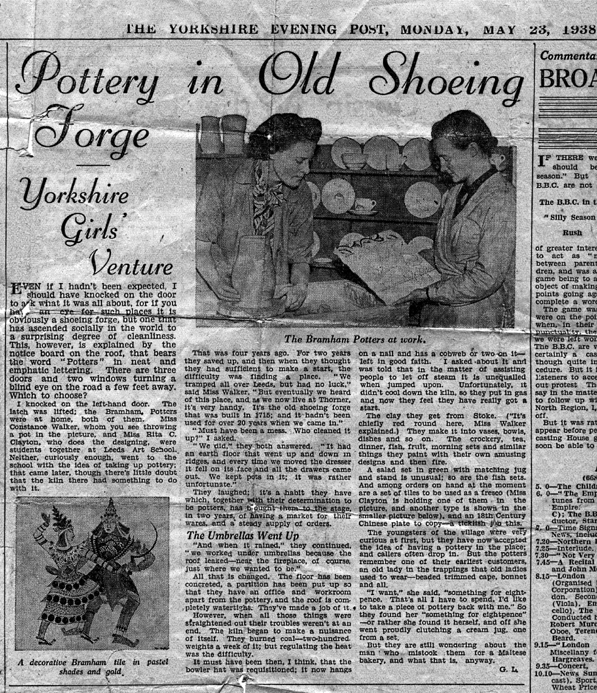 3. Newspaper article from The Yorkshire Evening Post dated 23rd May 1938. It describes the starting of the business by Rita Clayton and Constance Walker, the products they were producing including vases, bowls, dishes and of course the fresco tiles.