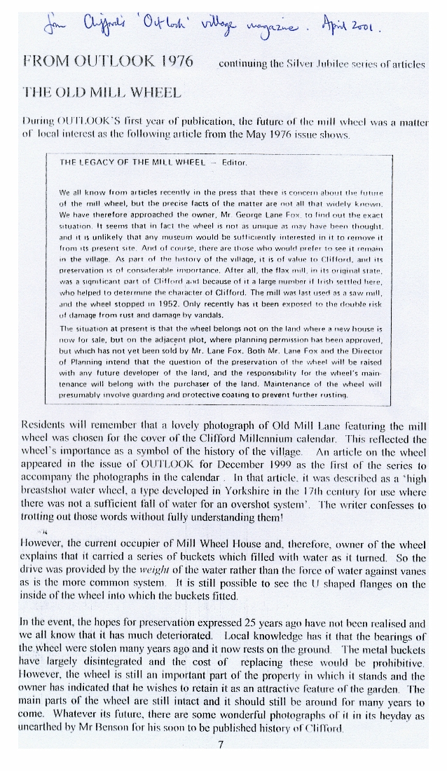 4. An article about the old mill wheel published in Clifford's "Outlook" magazine in April 2001