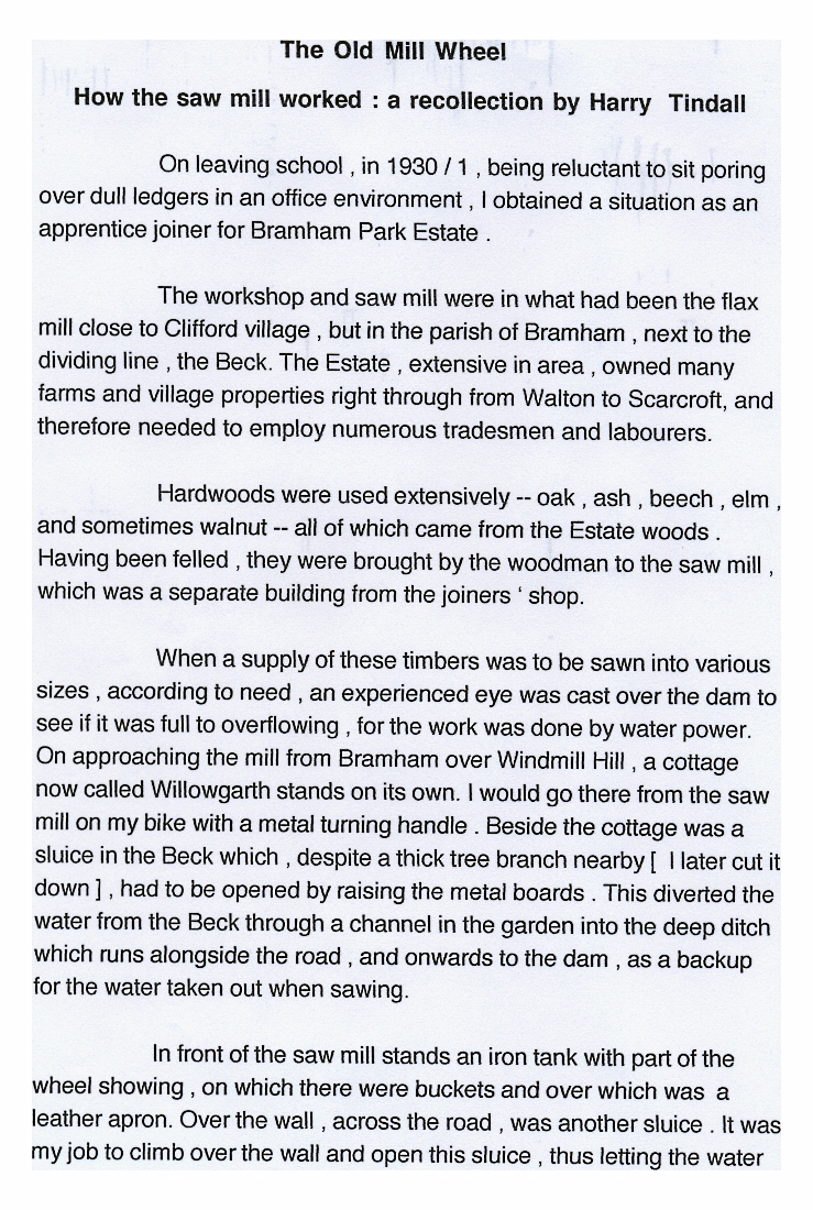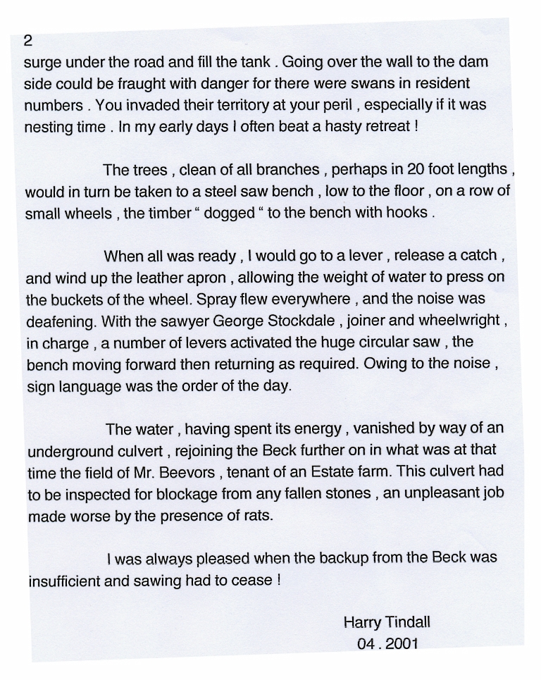 5. & 6. Recollections of Harry Tindall of his youth in the 1930s when, following the closure of the flax mill, the mill wheel was used to power a saw mill until it was closed in 1952.
