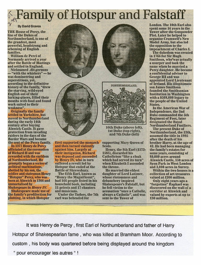 3. A newspaper article about the Dukes of Northumberland from the 1st Earl to the 10th Earl