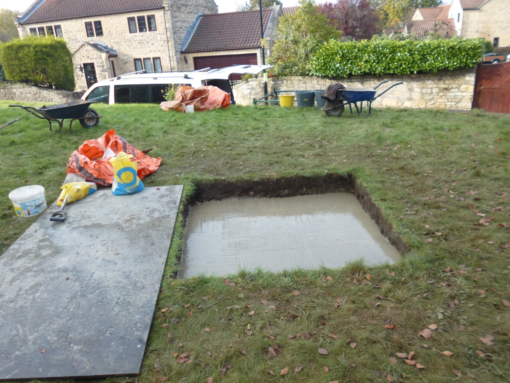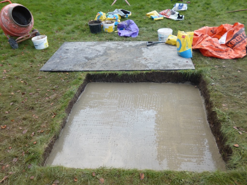 The foundation was completed with the insertion of a hard core base with concrete topping. The hole sized accordingly to accept the concrete base the Cross was mounted on in Black Wood.