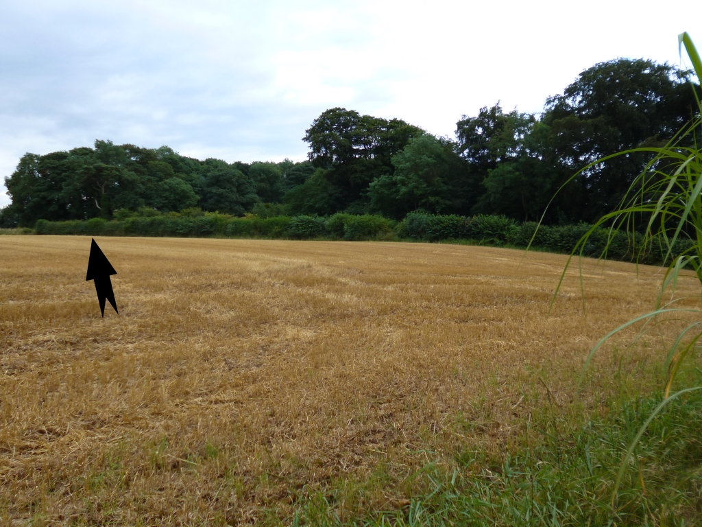 7. View from the field towards Black Wood Hollow with arrow indicating its last position.