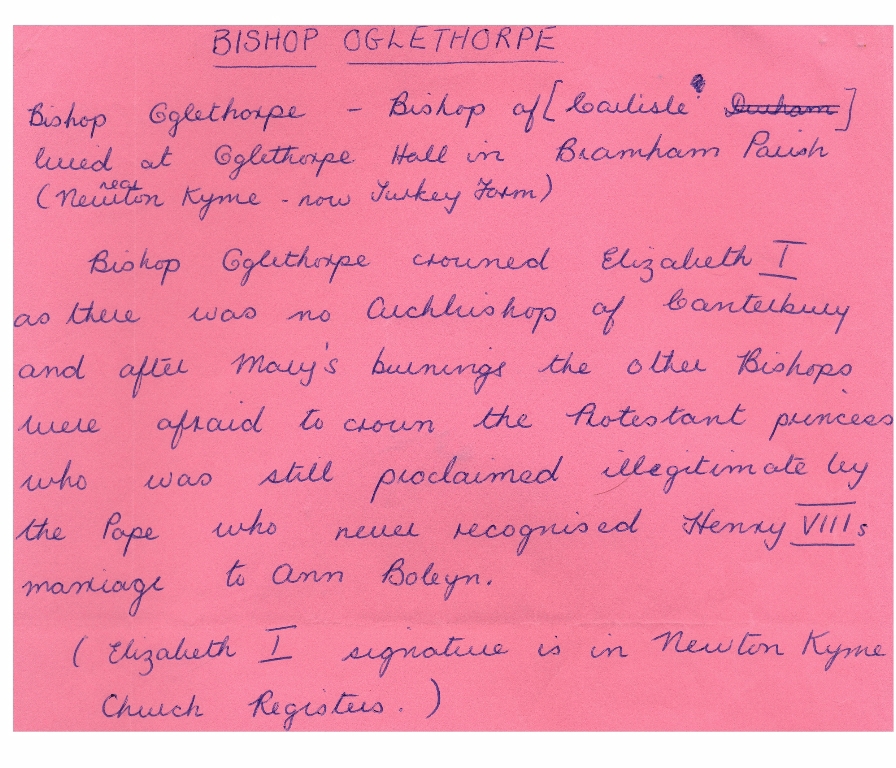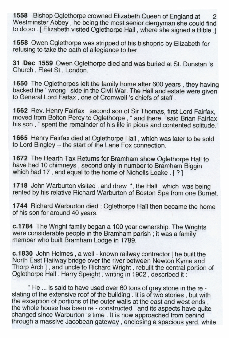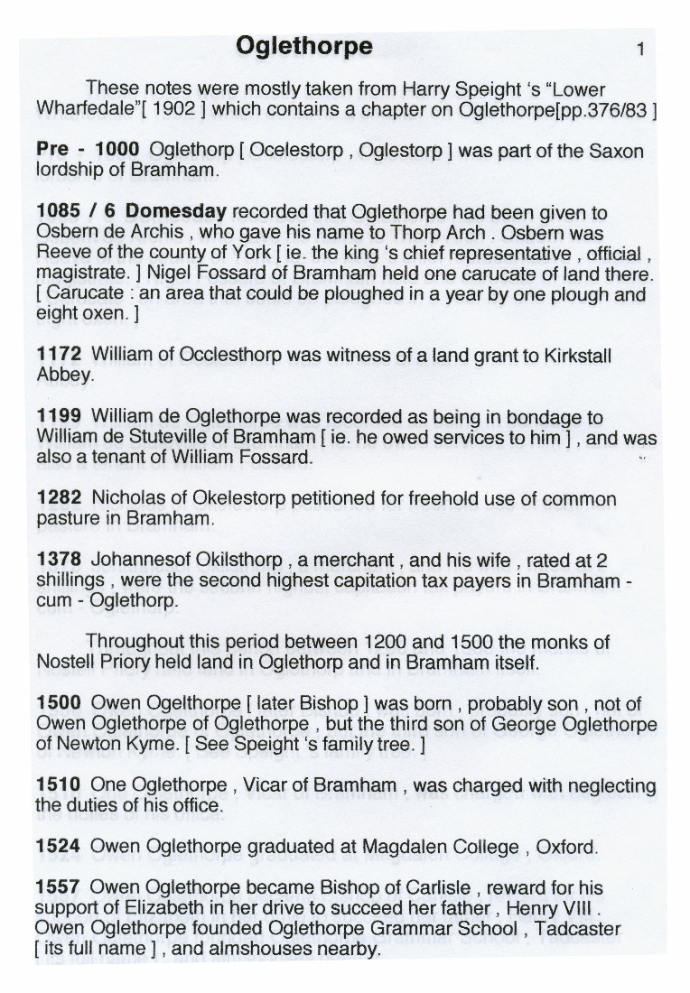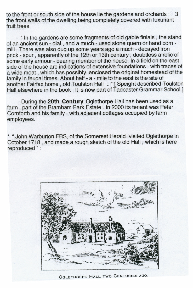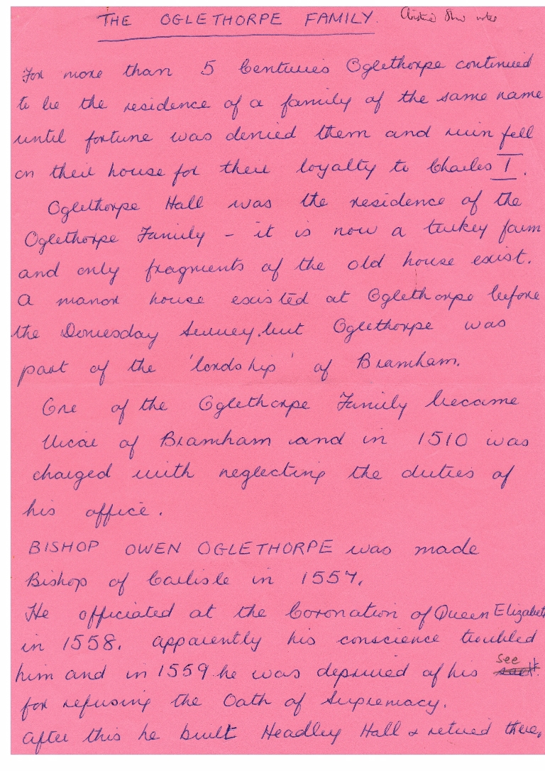 1. 2. & 3. Notes covering the period from pre-1000 to the 20th century mostly taken from Harry Speight's Lower Wharfedale (1902) which contains a chapter on Oglethorpe. On the final page is a copy of a rough sketch of the old hall by John Warburton FRS, who visited the hall in 1718
