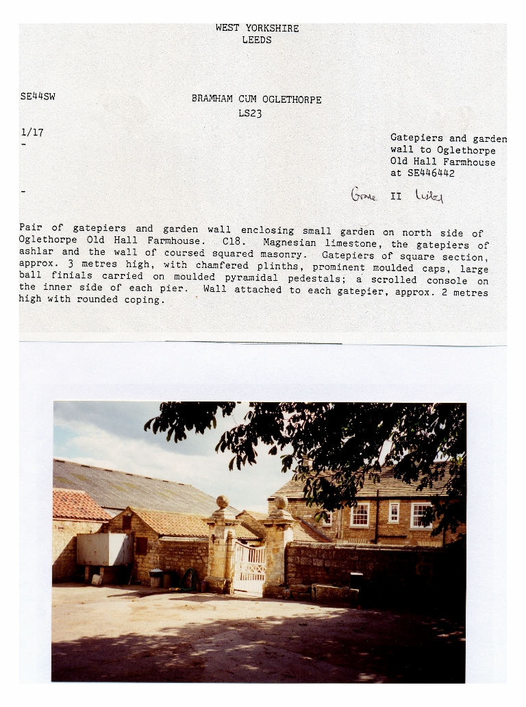 4. A photo, taken in about the year 2000, of the gatepiers and garden wall of Grade II listed Oglethorpe Old Hall Farmhouse, together with their architectural description