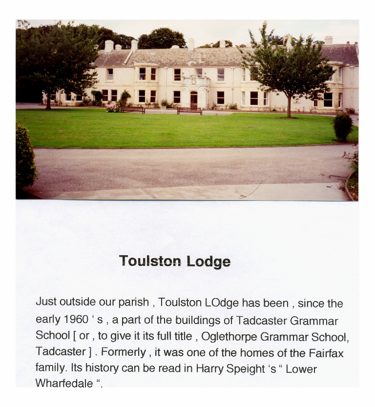 1. Toulston Lodge, being part of the buildings of Tadcaster Grammar School, is just outside the parish. This photo of the Lodge was taken in about the year 2000.