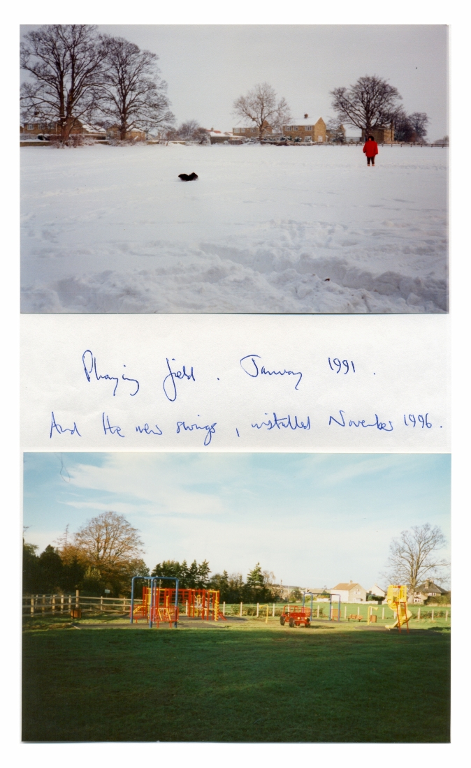 1. A view of the snow covered Playing Field in January 1991 and of some of the equipment in the children's play area in November 1996.