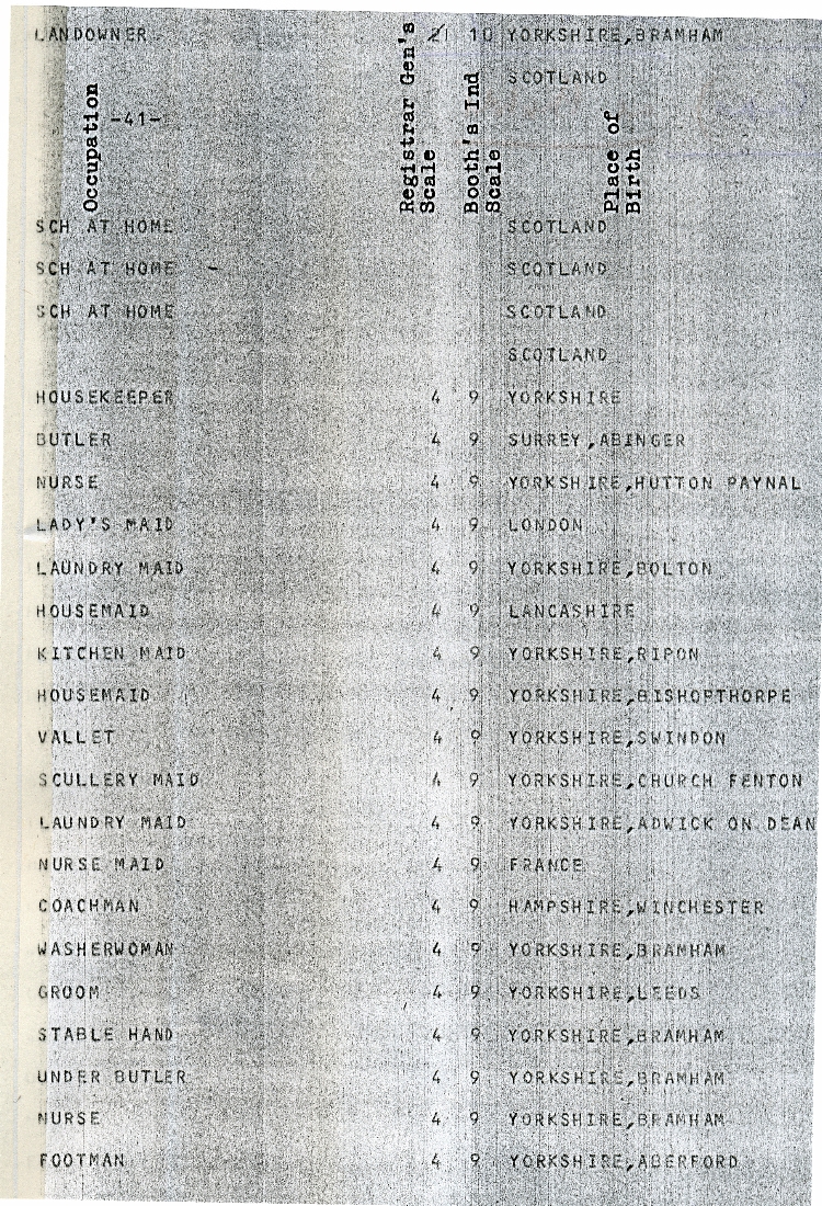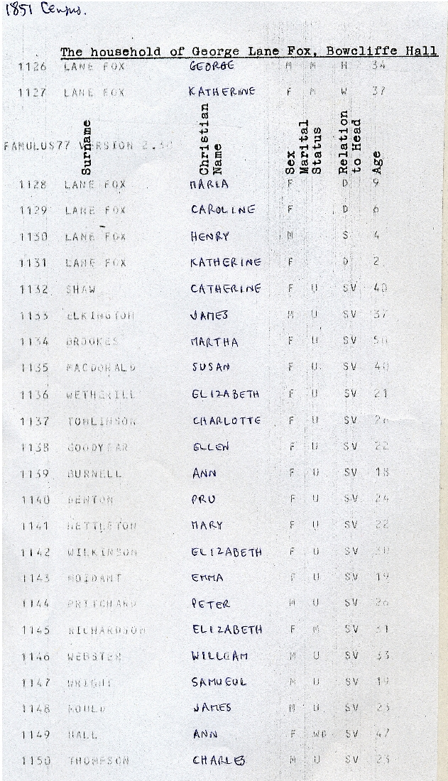 4. & 5. A page of the 1851 census listing the occupants of Bowcliffe Hall : George and Katherine Lane Fox, their four children and nineteen servants