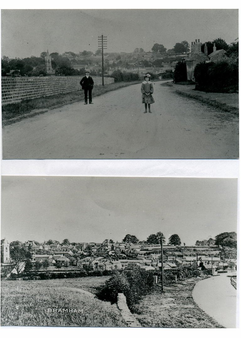 3. Two older photos looking towards the village from the upper part of Wetherby Road before World War I. The individuals in the upper photo are Mr. Herbert Tindall and Miss Mary Summersgill