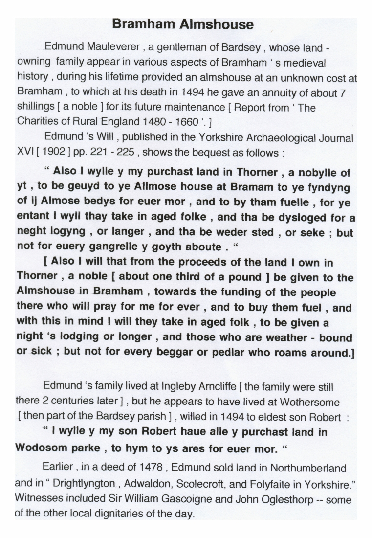 1. Information on Edmund Mauleverer who donated the almshouse to the village during his lifetime and on the annuity that he left for its maintenance after his death in 1494.