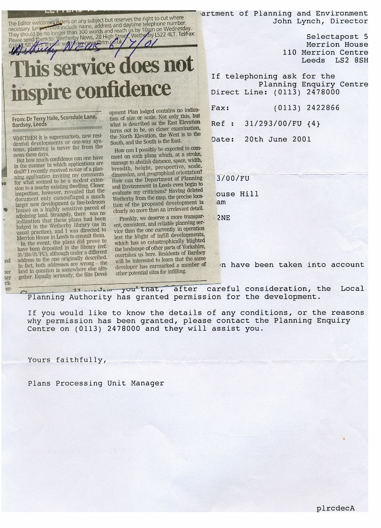 12. - 13. A letter from the Department of Planning and Environment, dated 20 June 2001, reporting the granting of planning permission.