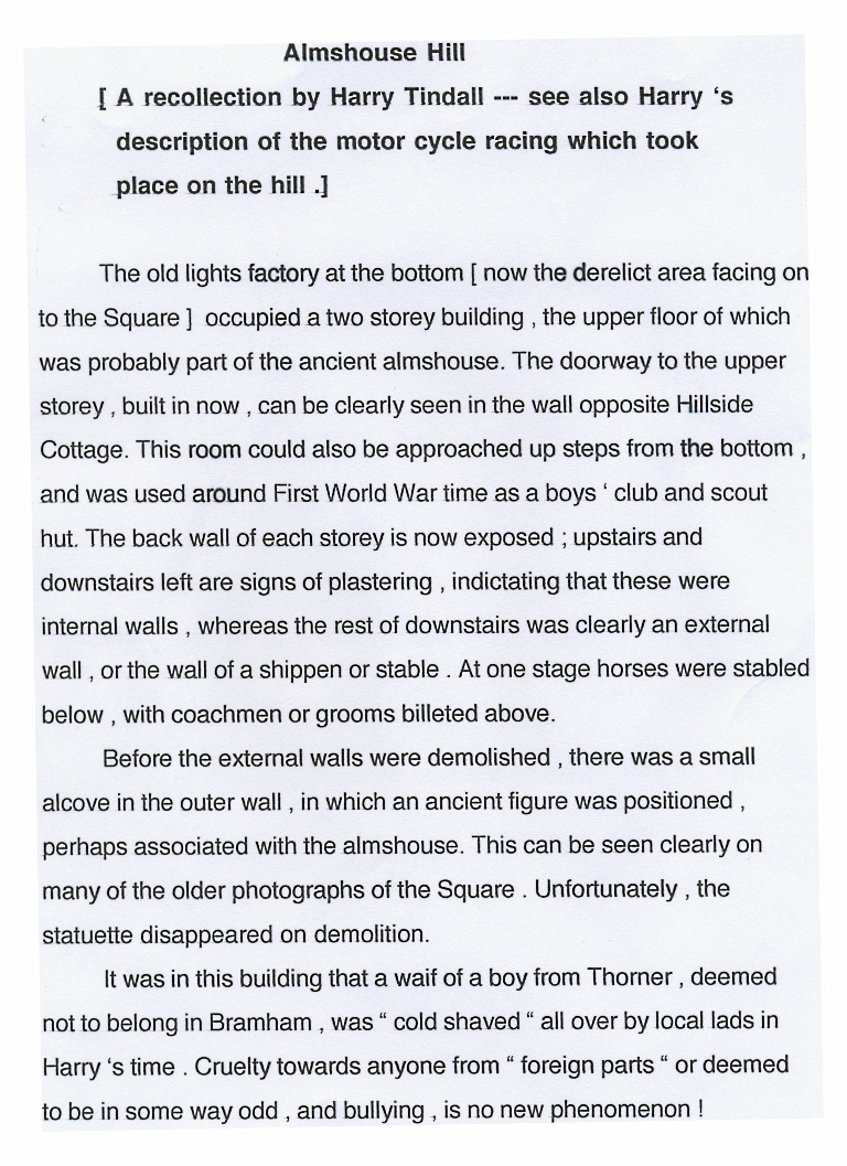 1. This recalls how the lower floor of the old almshouse was used as a lights factory during his youth and the upper floor was used as a boys' club and scout hut around the time of World War I.